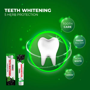 Achieve a brighter, healthier smile with our Teeth Whitening Toothpaste, powered by 5 Natural Herb Protection. This toothpaste gently removes stains, freshens breath, and promotes overall oral health, all without the use of harsh chemicals or artificial additives.